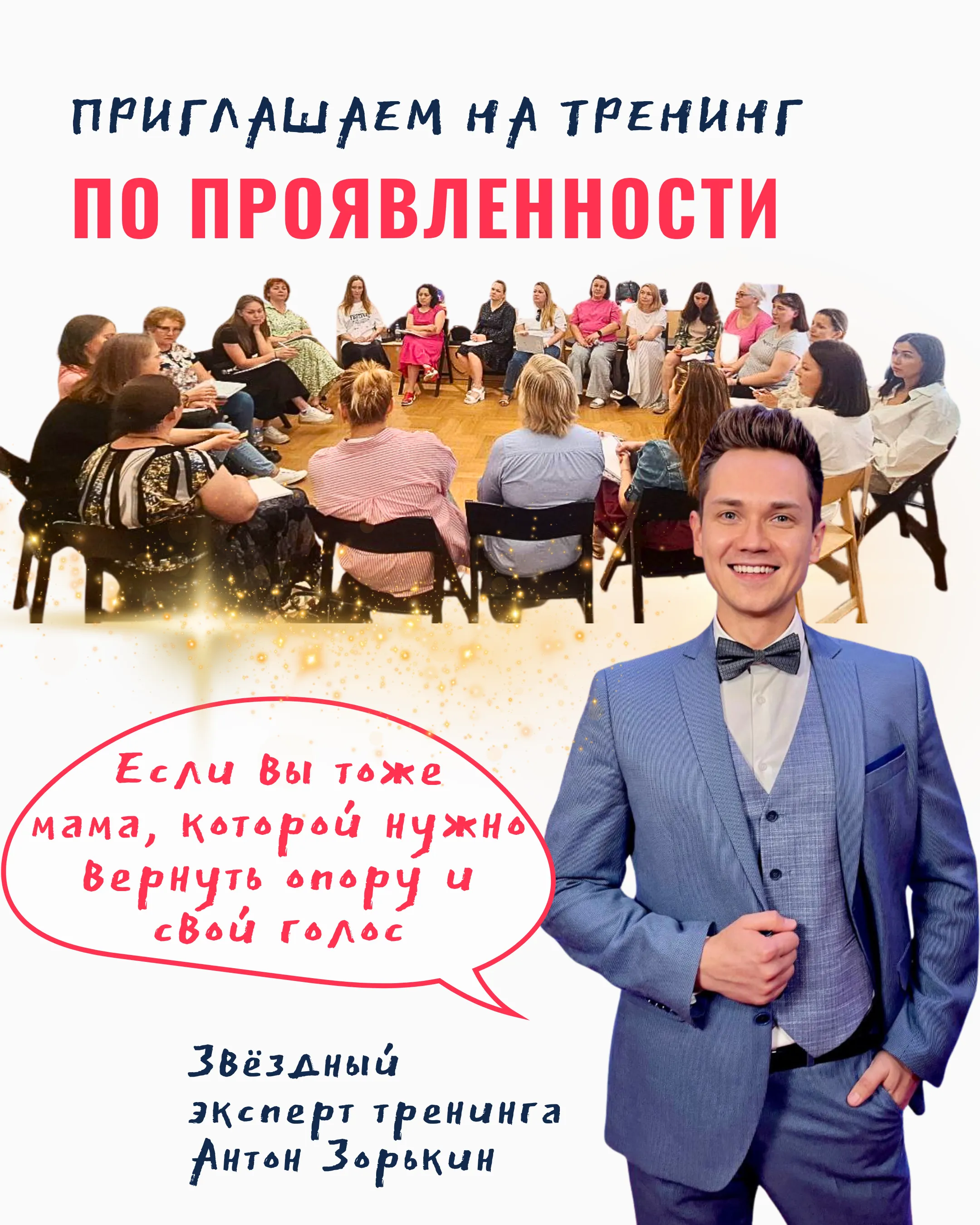 Сейчас у нас идёт проект “Путь к себе” для мам детей с инвалидностью, которым мы помогаем вновь обрести ресурс. Для них постоянно проходят полезные встречи с разными помогающими классными экспертами. И в это воскресенье будет суперполезная встреча – тренинг со звёздным экспертом, телеведущим федеральных каналов и преподавателем в сфере медиа и ораторского искусства, Антоном Зорькиным.